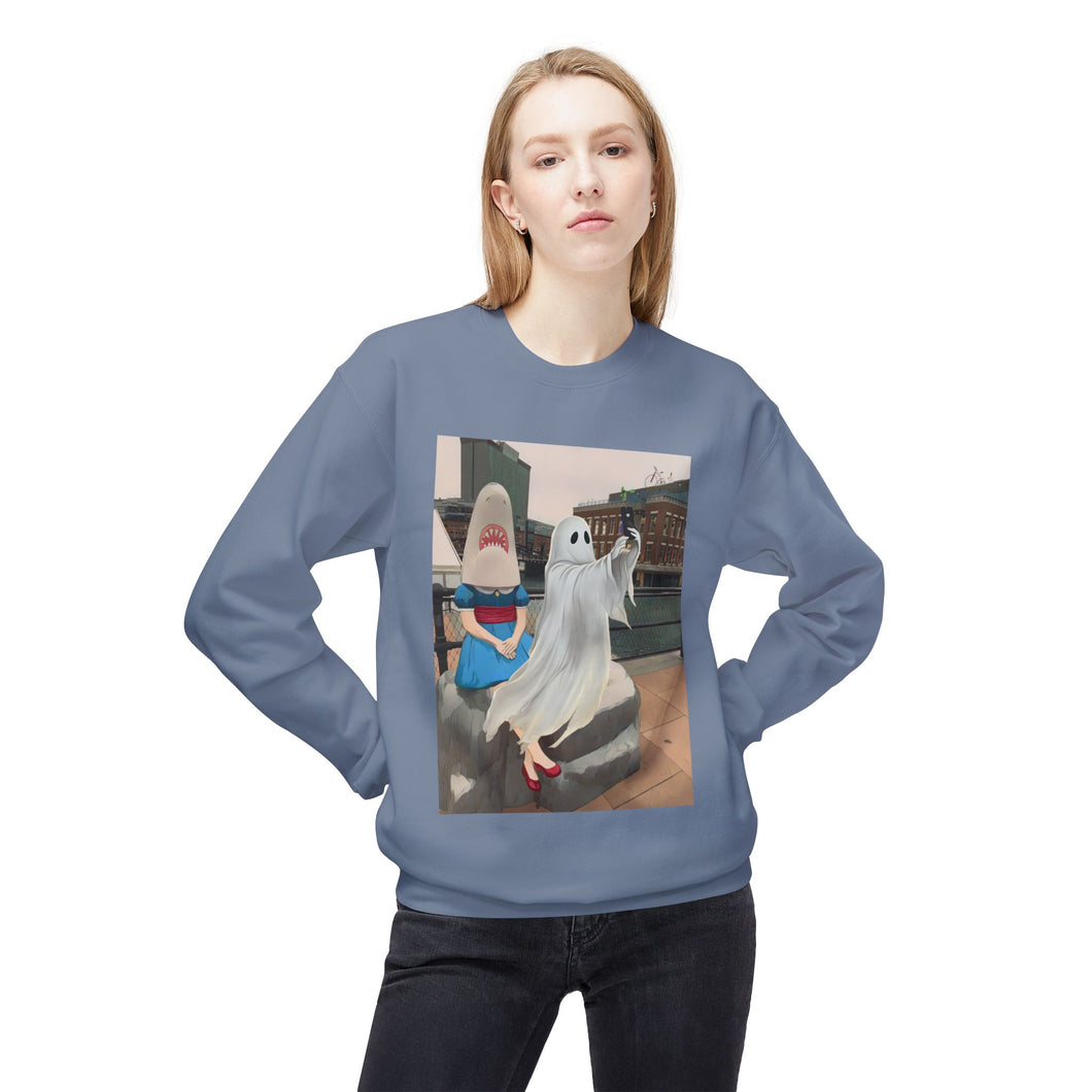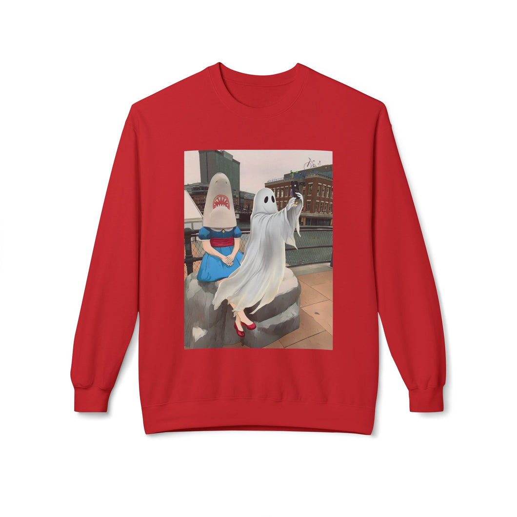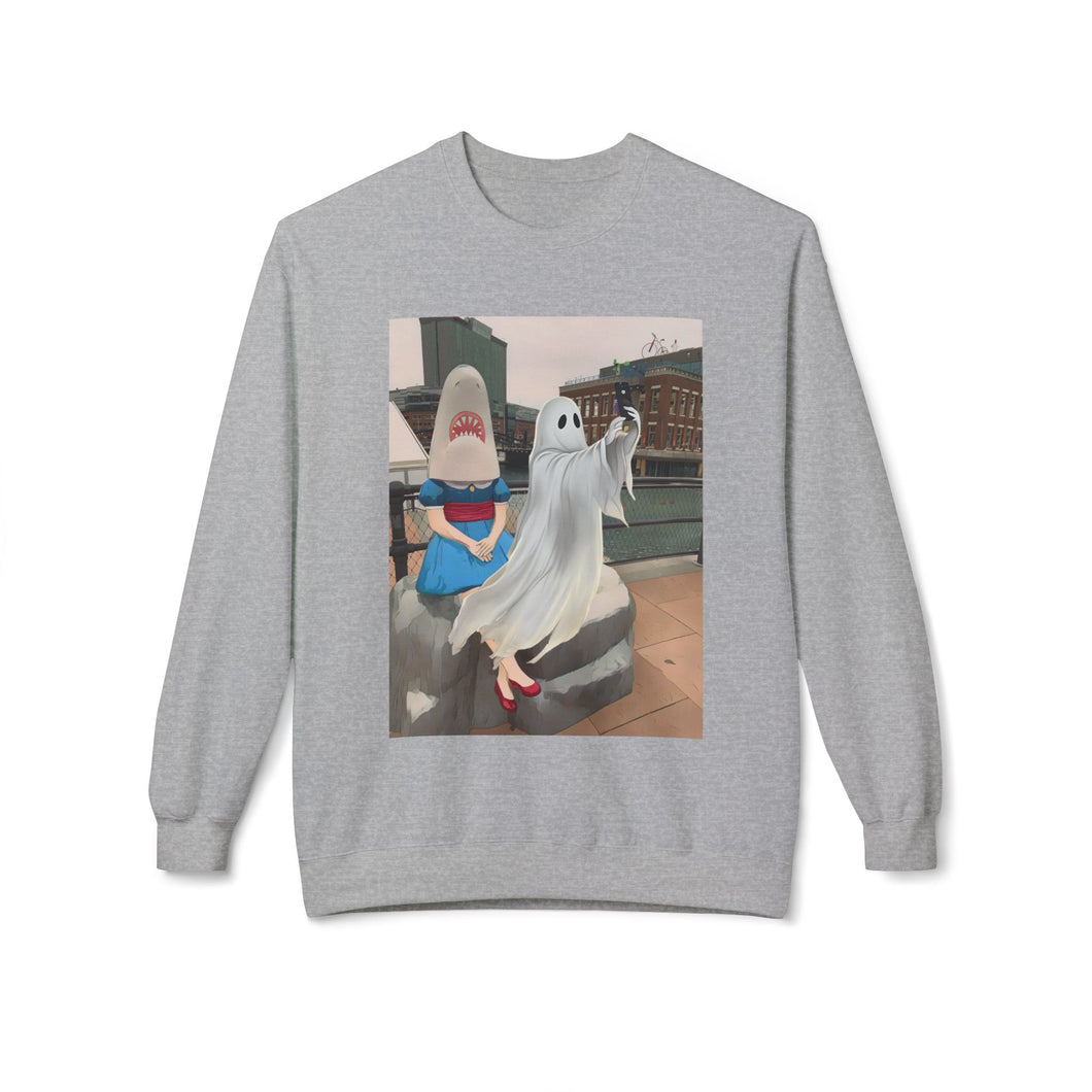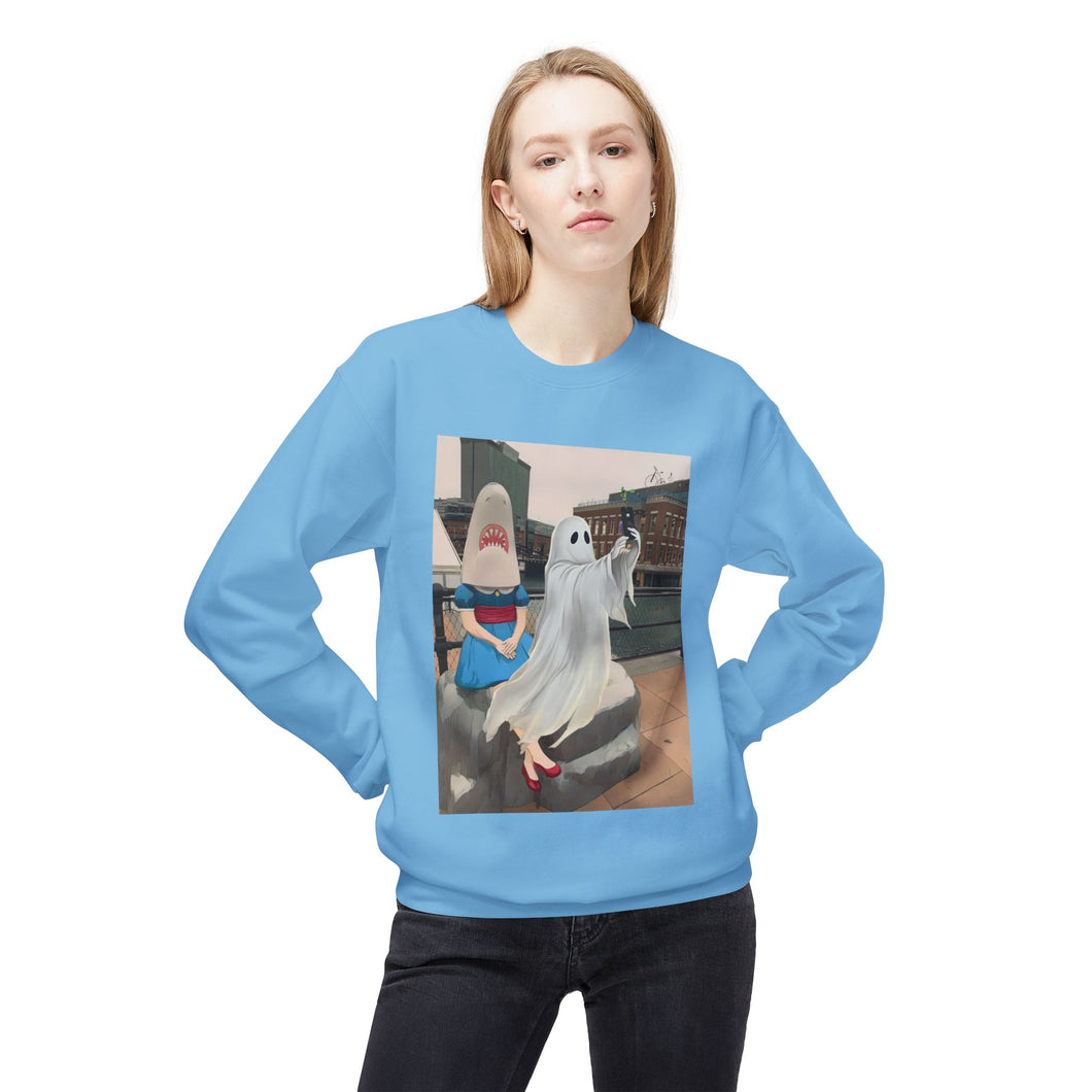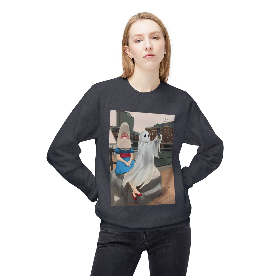 Shark Girl Selfie Buffalo Ghost Crewneck Sweatshirt, Cozy Fall Fashion, Halloween Apparel, Spooky Gift, Unisex Casual Wear
